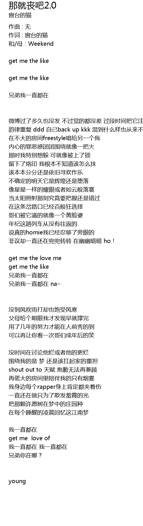 | 韵律重复 ddd 自己back up kkk 混到什么样也从来不骄傲 | |