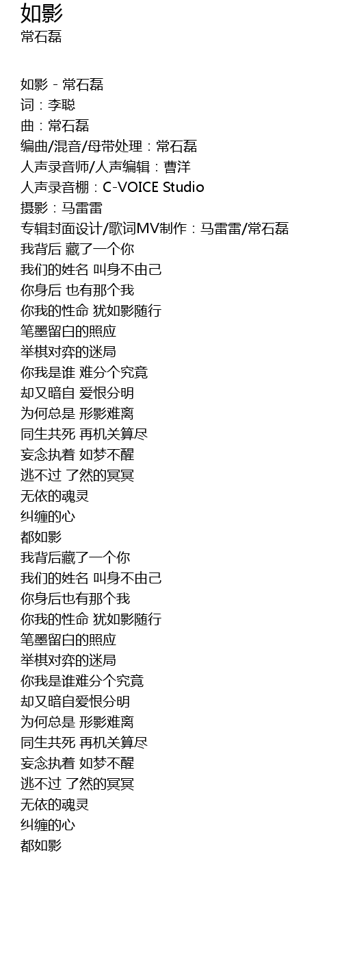 | 专辑封面设计/歌词MV制作:马雷雷/常石磊 | |