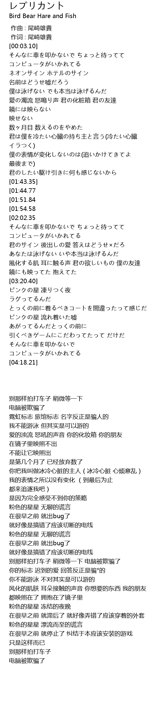 | [01:32.1] | 僕の表情が変化しないのは(追いかけてきてよ 最後まで) |