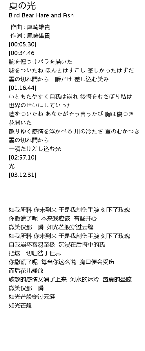 | [02:35.56] | 散りゆく感情を浮かべる 川の冷たさ 夏のむかつき |