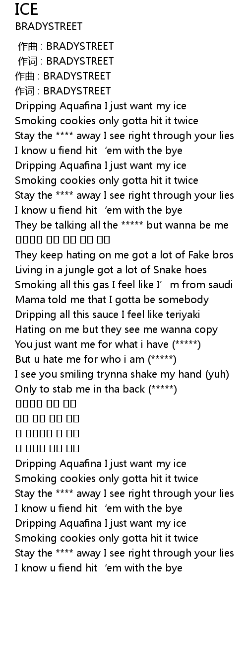 | [01:15.388] | Dripping Aquafina I just want my ice |