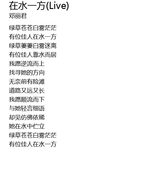 | [00:27.760] | yǒu wèi jiā rén zài shuǐ yī fāng |