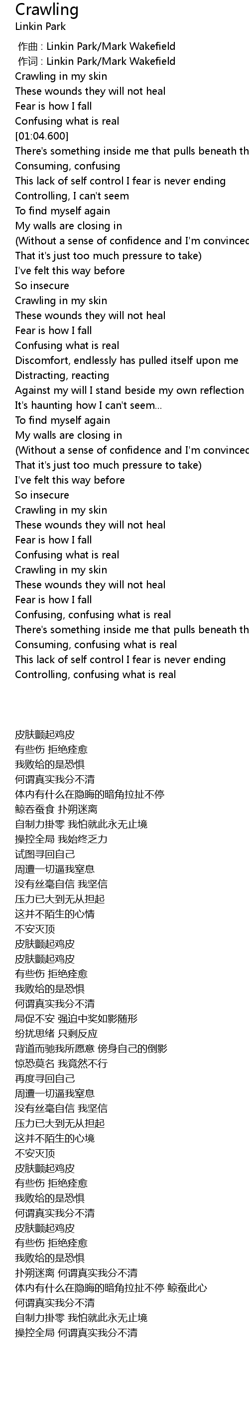 | [00:46.100] | Crawling in my skin |