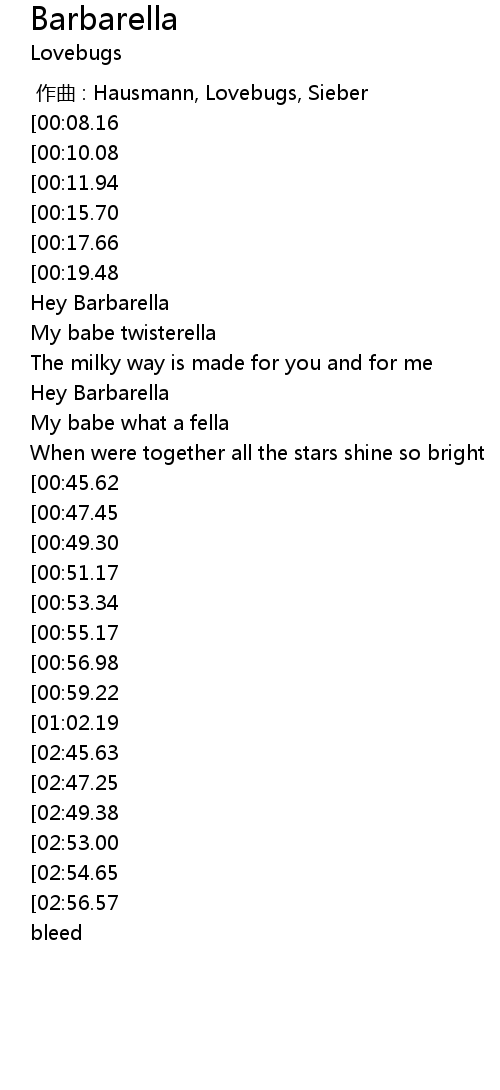 | [01:34.32][00:15.70] | Hey Barbarella |