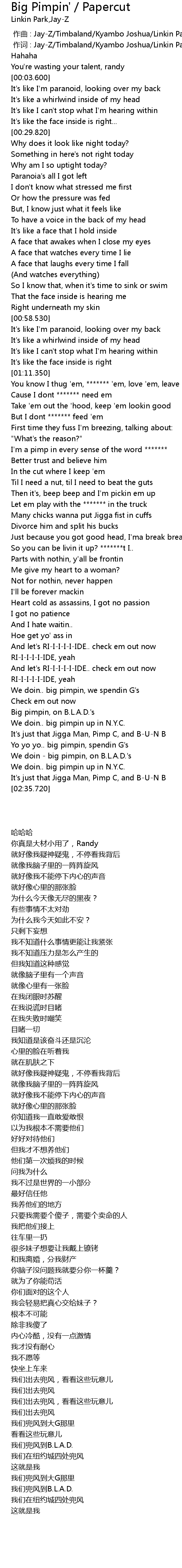 | [00:00.00] | 作曲 : Jay-Z/Timbaland/Kyambo Joshua/Linkin Park |