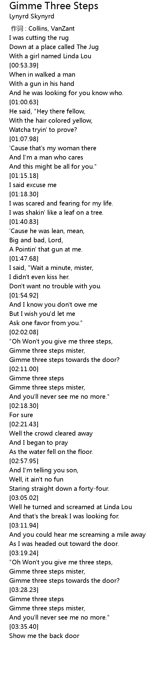 | [02:11.94] | Gimme three steps |