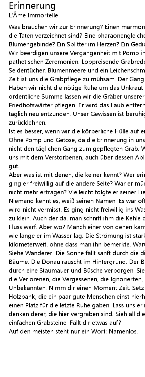 | Siehe Wanderer: Die Sonne f llt sanft durch die dichten Laubbl tter der alten B ume. Die Donau rauscht im Hintergrund. Der Blick auf ihre dunklen Wasser ist durch eine Staumauer und Bü sche verborgen. Sie hat sie einst alle angespü lt, die Verlorenen, die Vergessenen, die Ignorierten, die Verzweifelten, die Unbekannten. Nimm dir einen Moment Zeit. Setz dich zu mir auf die knarrende Holzbank, die ein paar gute Menschen einst hierhin stellten als sie all denen einen Platz fü r die letzte Ruhe gaben. Lass uns erinnern. Lass uns gemeinsam denken derer, die hier vergraben sind. Sieh all die schlichten Kreuze, die einfachen Grabsteine. F llt dir etwas auf? | |