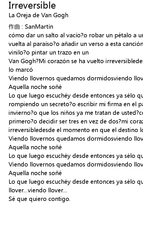 | Lo que luego escuche y desde entonces ya se lo que yo quiero contigoco mo hablar rompiendo un secreto? o escribir mi firma en el papel? co mo ver que vuelve a ser invierno? o que los ni os ya me tratan de usted? co mo abrir mi hucha de primero? o decidir ser tres en vez de dos? mi corazo n se ha vuelto irreversibledesde el momento en que el destino lo marco | |