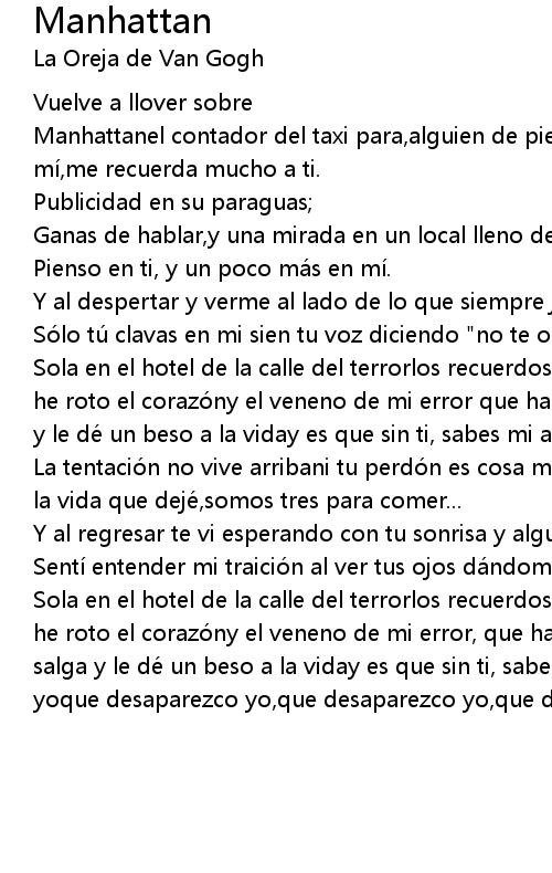 | Sola en el hotel de la calle del terrorlos recuerdos con espinas dirá n que te he roto el corazó ny el veneno de mi error que hace eternas las heridasque salga y le dé un beso a la viday es que sin ti, sabes mi amor que desaparezco yo. | |