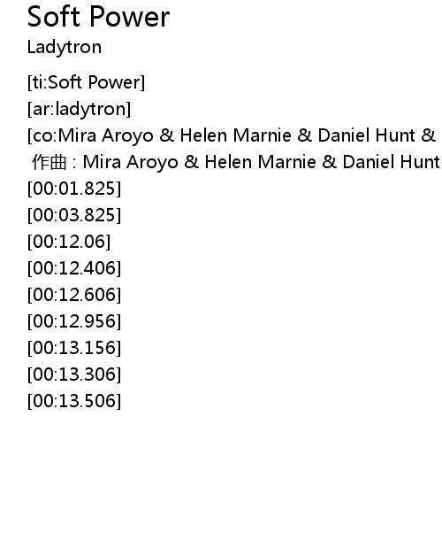 | [00:00.00] | 作曲 : Mira Aroyo & Helen Marnie & Daniel Hunt & Reuben Wu |