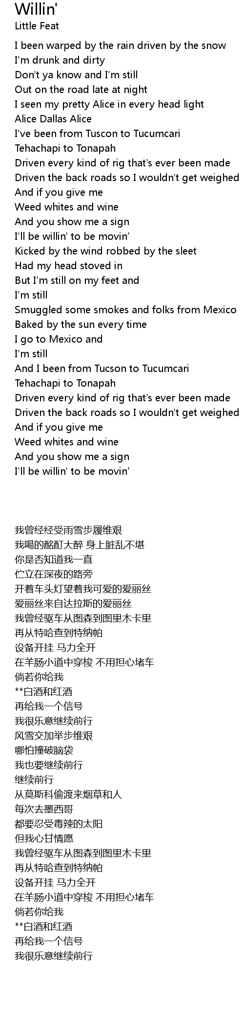 | Song | Willin' |