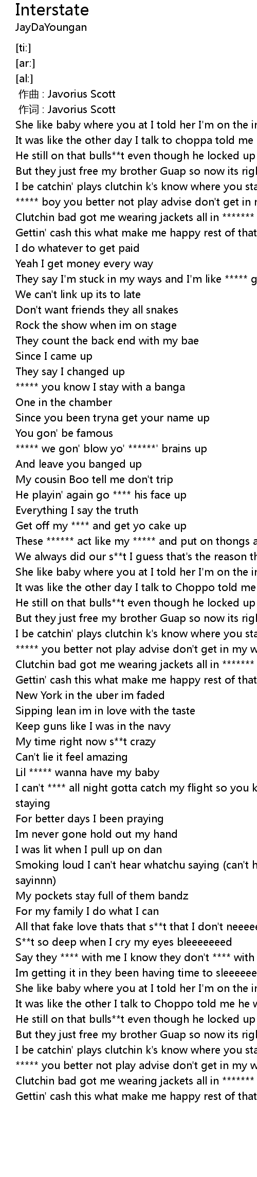 | [00:00.000] | She like baby where you at I told her I' m on the interstate |