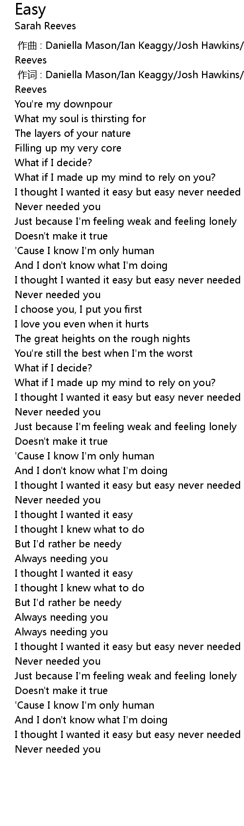 | [02:53.48] | I thought I wanted it easy but easy never needed |