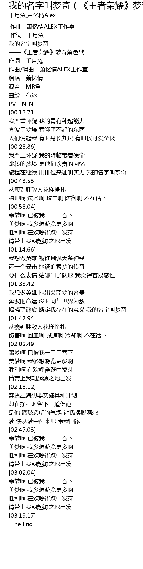 | [01:41.83] | 揭晓了谜底 断定我存在的意义 我的名字叫梦奇 |