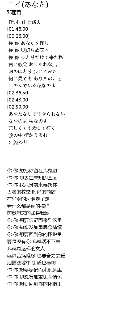 | [00:00.00][01:46.00] | > 唄: 邓丽君 |