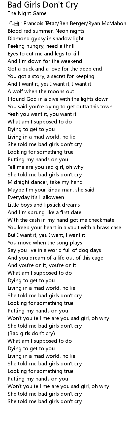 | [02:42.169] | Bad girls don' t cry |
