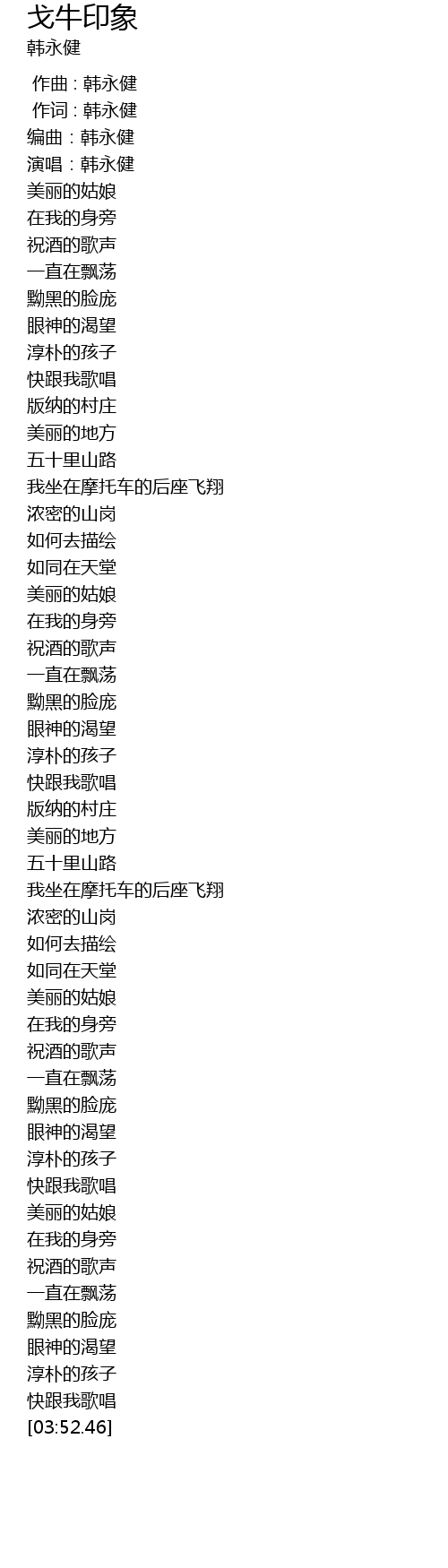 | [00:03.43] | 编曲:韩永健 |