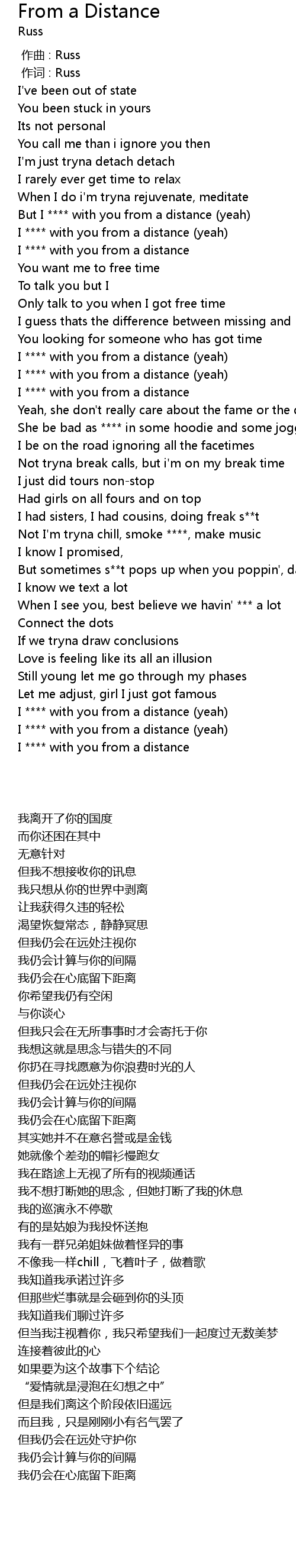 | [02:22.59] | I **** with you from a distance (yeah) |