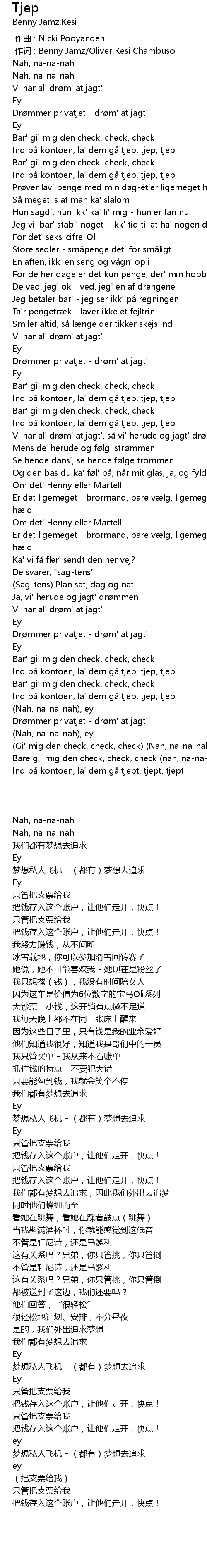 | [00:20.38] | Ind p kontoen, la' dem g tjep, tjep, tjep |