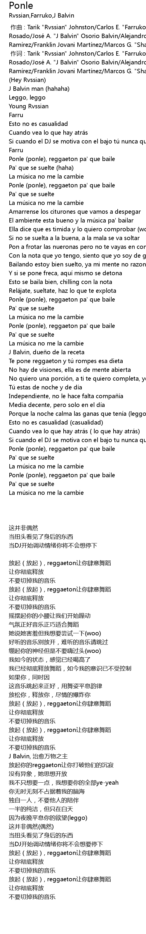 | [00:00.348] | zuo ci : Tarik " Rvssian" Johnston Carlos E. " Farruko" Reyes Rosado Jose A. " J Balvin" Osorio Balvin Alejandro " Sky Rompiendo" Rami rez Franklin Jovani Marti nez Marcos G. " Sharo Towers" Pe rez |