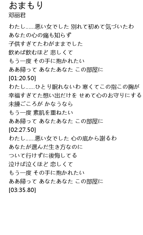 | [01:48.60] | 幸福すぎてた想い出だけを せめて心のお守りにする |