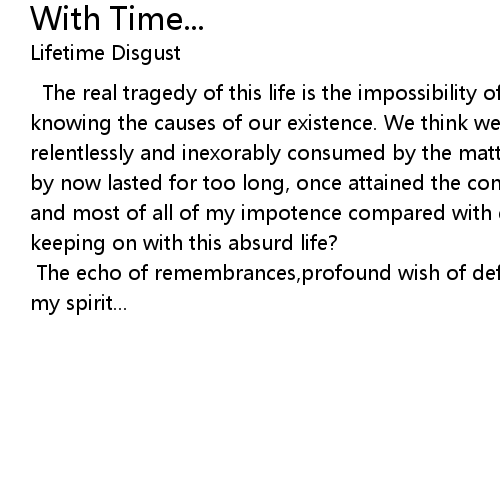 | The real tragedy of this life is the impossibility of knowing oneself, of knowing the causes of our existence. We think we live, but we are lived, relentlessly and inexorably consumed by the matter we arise from. My torment has by now lasted for too long, once attained the consciousness of my uselessness and most of all of my impotence compared with destiny (included mine) why keeping on with this absurd life? | |