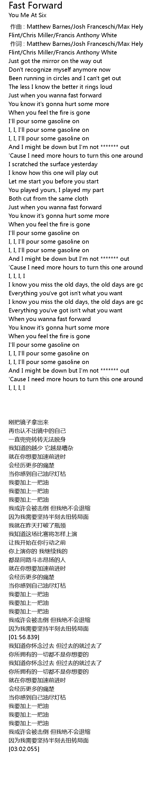 | [00:01.000] | 作词 : Matthew Barnes/Josh Franceschi/Max Helyer/Daniel Flint/Chris Miller/Francis Anthony White |