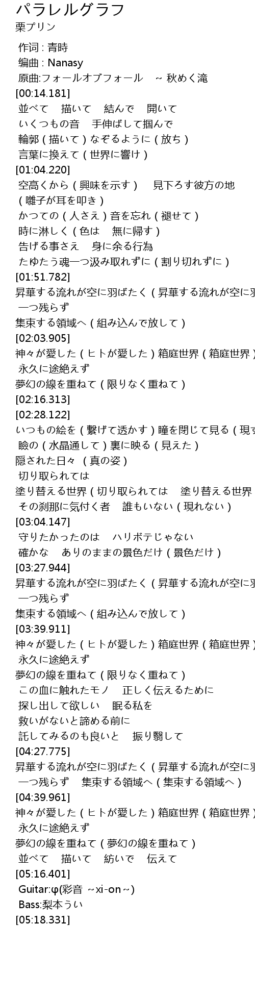 | [04:46.052] | 永久に途絶えず 夢幻の線を重ねて(夢幻の線を重ねて) |