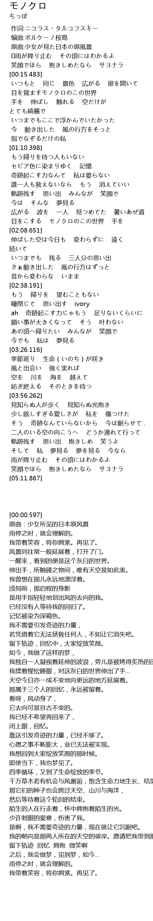 | [00:36.224] | 目を覚ますモノクロのこの世界 |