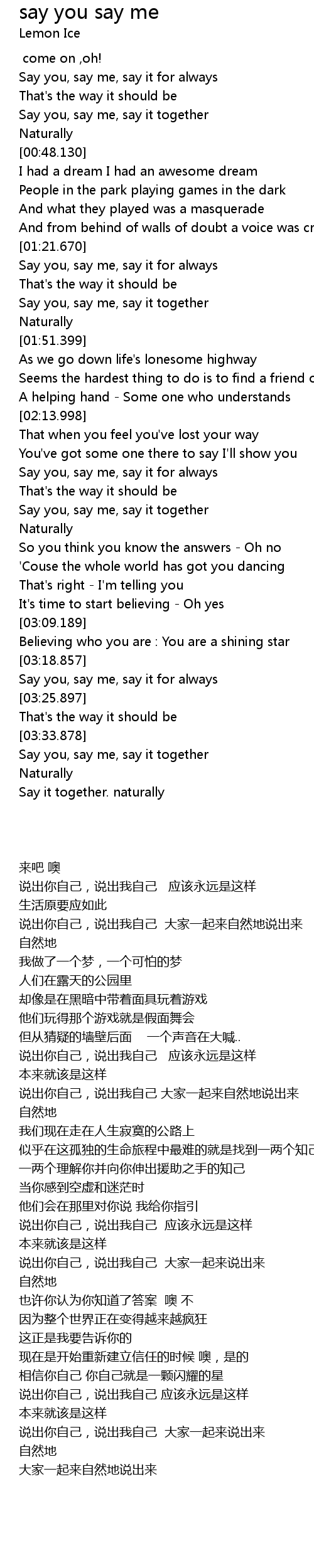 | [03:35.370] | Say you, say me, say it together |