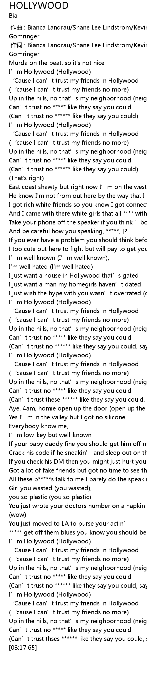 | [01:33.11] | ‘Cause I can’t trust my friends in Hollywood |