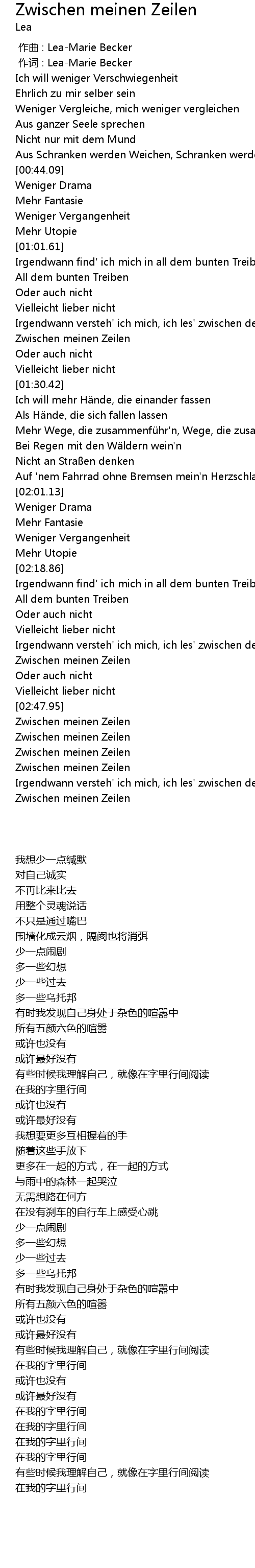| [02:34.90] | Irgendwann versteh' ich mich, ich les' zwischen den Zeilen |