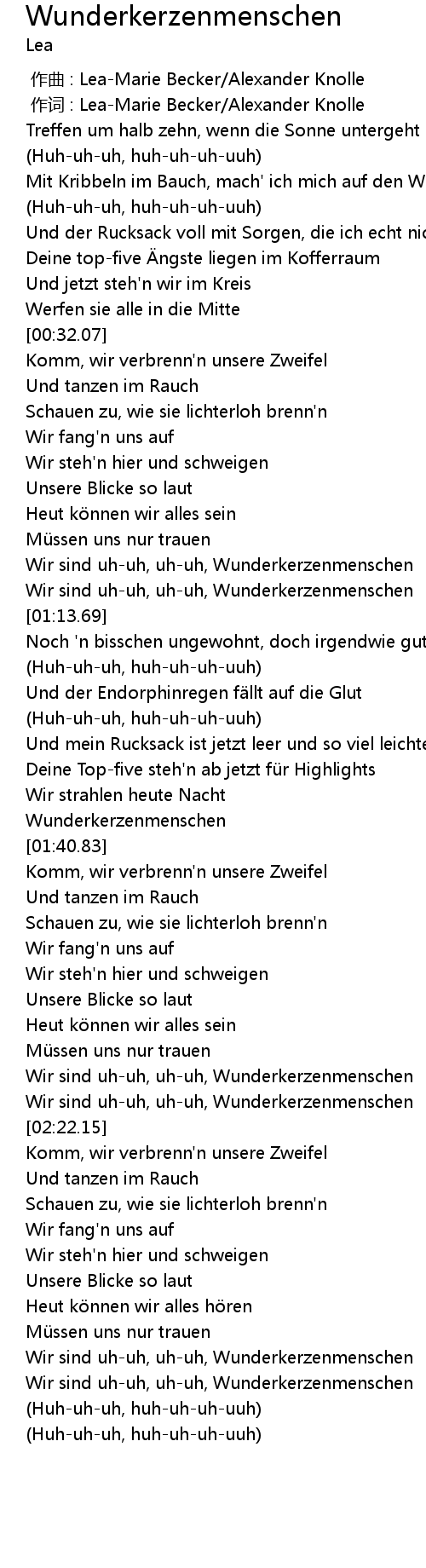 | [02:15.81] | Wir sind uhuh, uhuh, Wunderkerzenmenschen |
