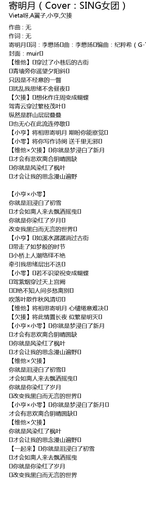 | 寄明月 词:李懋扬 曲:李懋扬 编曲:纪粹希(G-Tracy) 调:溱绫西陌 封面:muir | |