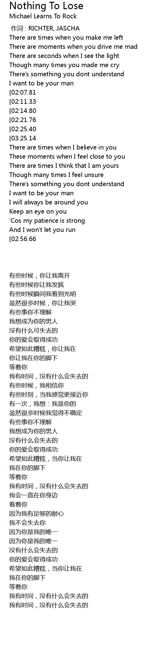 | [03:04.67][02:07.81][00:57.29] | Nothing to lose |
