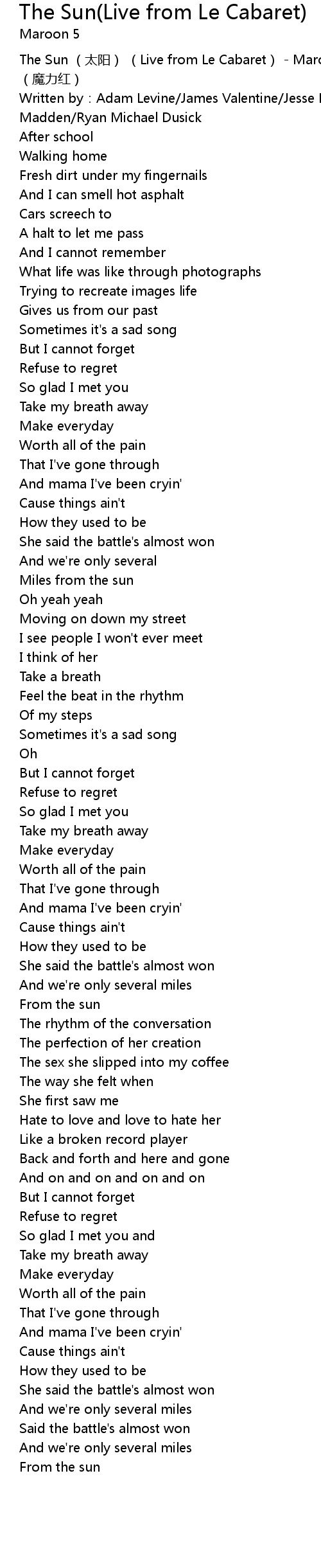 | [00:00.360] | The Sun tài yáng Live from Le Cabaret Maroon 5 mó lì hóng |
