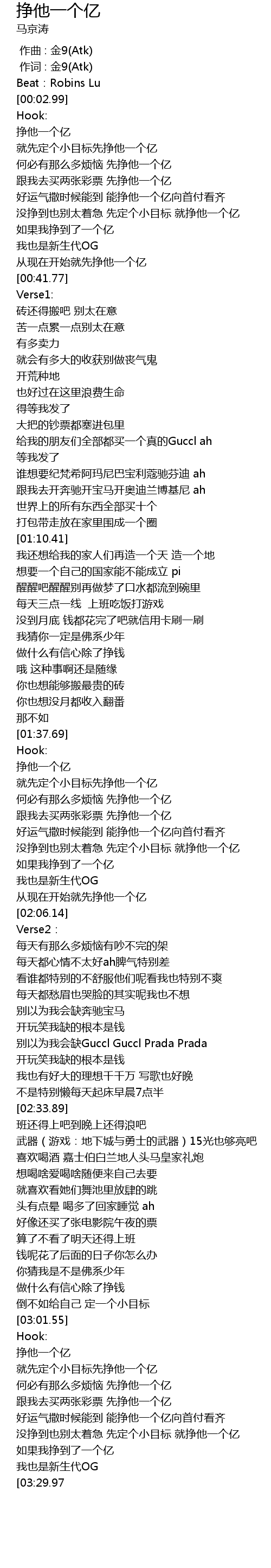 | [01:44.91] | 何必有那么多烦恼 先挣他一个亿 |