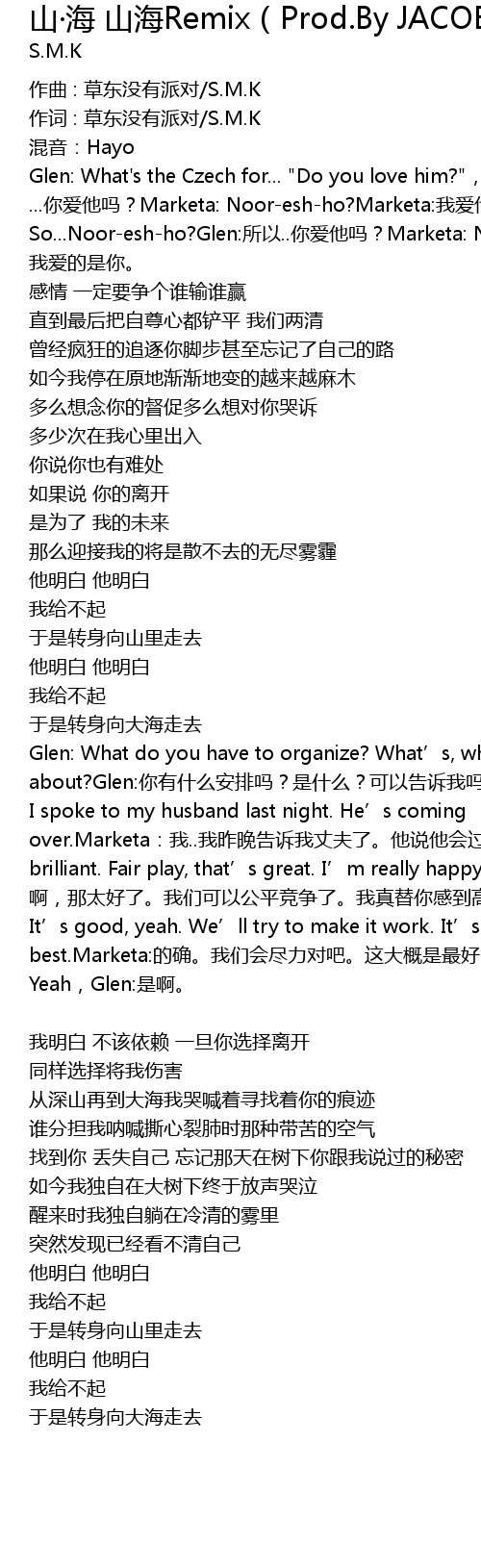 | Glen: What' s the Czech for... " Do you love him?", Glen: Czech ... nǐ ài tā ma? Marketa: Nooreshho? Marketa: wǒ ài tā ma? Glen: So... Nooreshho? Glen: suǒ yǐ.. nǐ ài tā ma? Marketa: Noorhotebbe. Marketa: wǒ ài de shì nǐ. | |