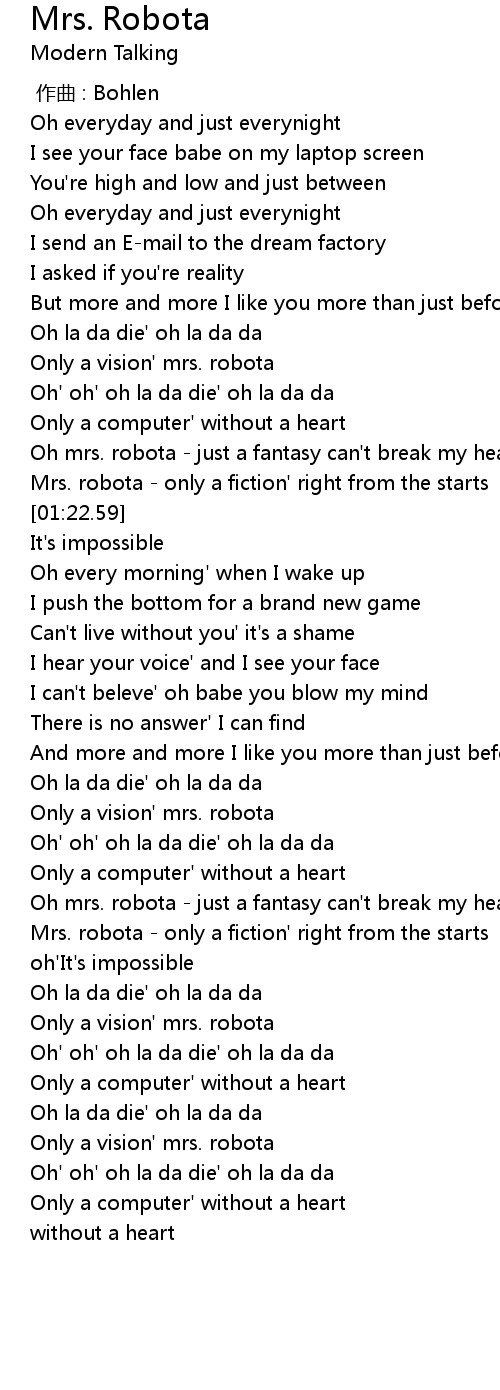 | [02:23.62] | Oh mrs. robota - just a fantasy can't break my heart |