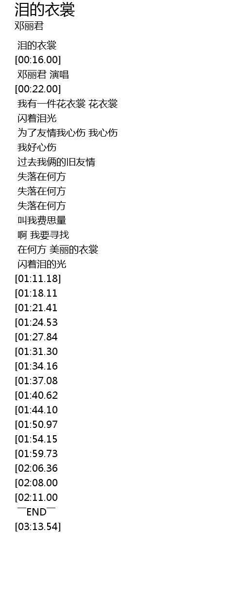 | [01:12.60][02:08.00] | 邓丽君:《泪的衣裳》 |