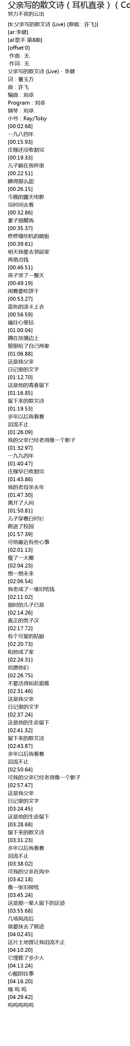 | [00:00.42] | 父亲写的散文诗 (Live) - 李健 |