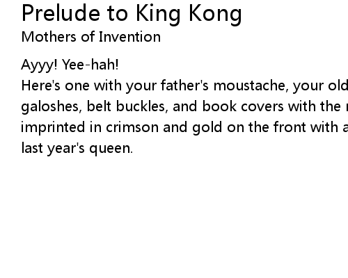 | Here's one with your father's moustache, your old cookie jar, rubbers, sneakers, galoshes, belt buckles, and book covers with the name of your high school neatly imprinted in crimson and gold on the front with a picture of the goal post and last year's queen. |