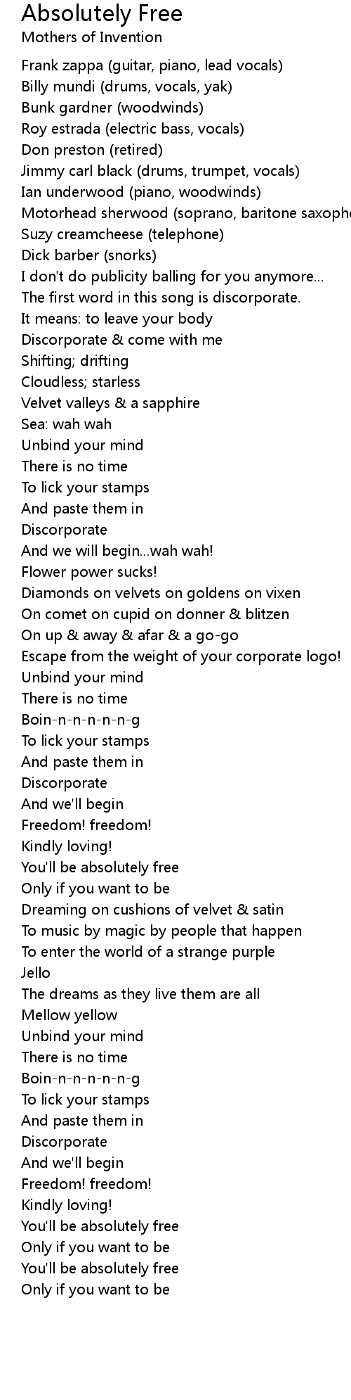 Frank zappa (guitar, piano, lead vocals) |