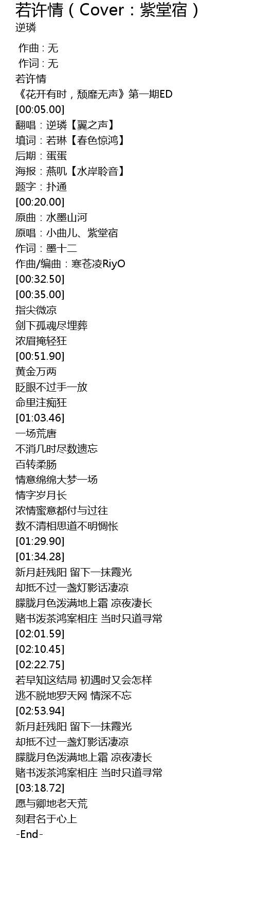 | [00:25.00] | 原唱:小曲儿、紫堂宿 |
