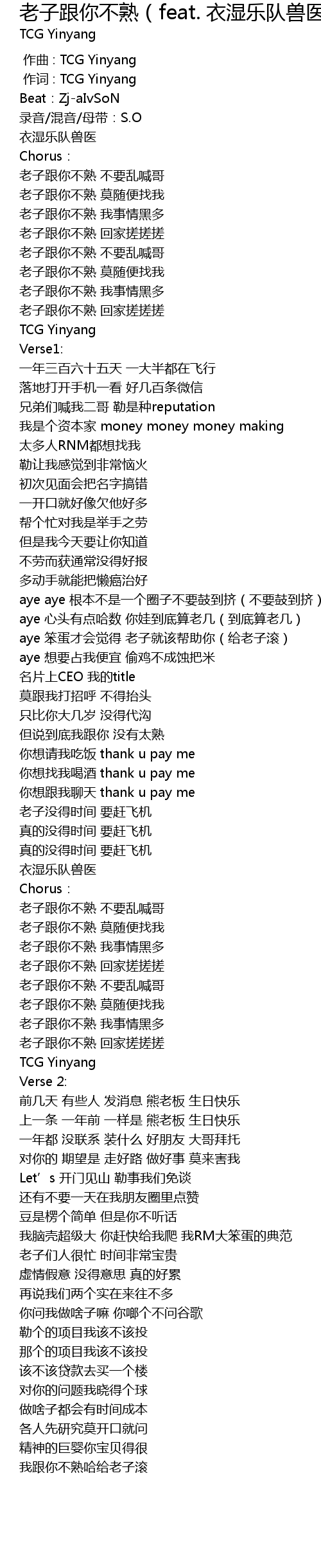 | Song | 老子跟你不熟(feat. 衣湿乐队兽医) |