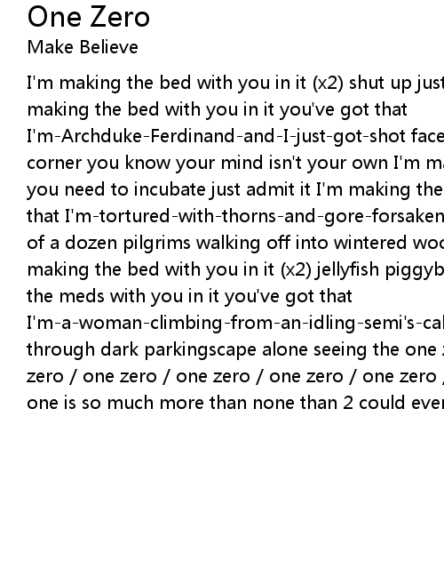 I'm making the bed with you in it (x2) shut up just sit still just a minute i'm making the bed with you in it you've got that I'm-Archduke-Ferdinand-and-I-just-got-shot face on weren't you born into a corner you know your mind isn't your own I'm making the bed with you in it (x2) you need to incubate just admit it I'm making the bed with you in it you've got that I'm-tortured-with-thorns-and-gore-forsaken-for-whose-sake on like any one of a dozen pilgrims walking off into wintered woods one zero / on zero / I'm making the bed with you in it (x2) jellyfish piggybank pomegranate I'm baking the meds with you in it you've got that I'm-a-woman-climbing-from-an-idling-semi's-cab on carrying only her pillow through dark parkingscape alone seeing the one zero / one zero / one zero / one zero / one zero / one zero / one zero / one zero / one zero / being the one zero one is so much more than none than 2 could ever be to one |