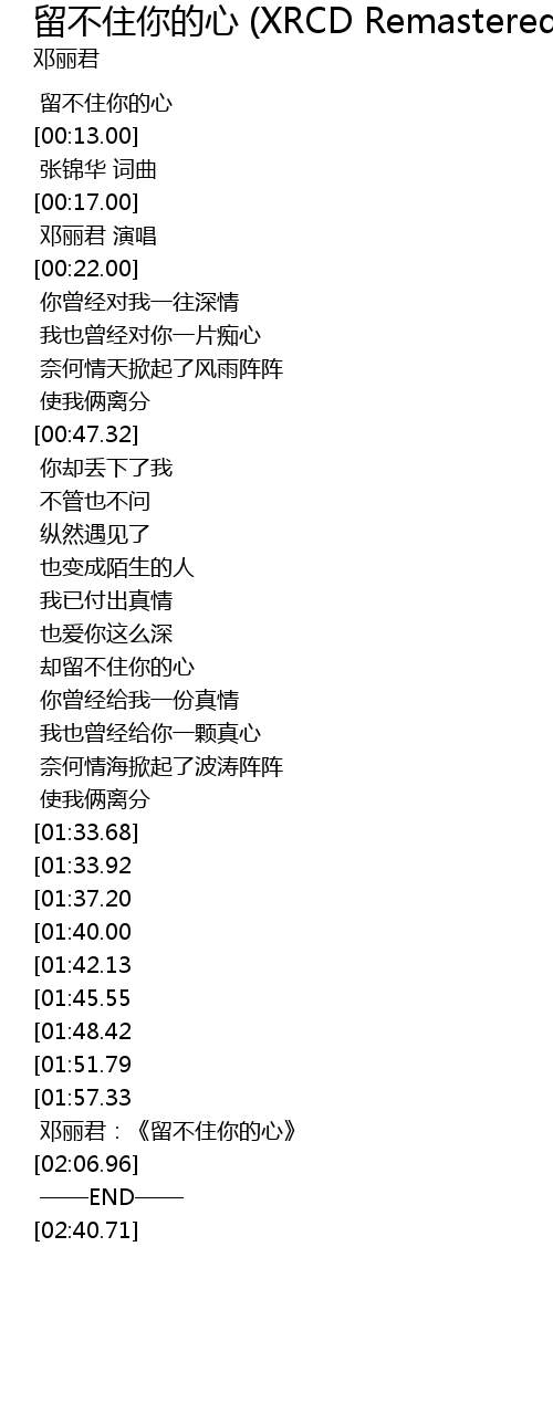 | [01:59.30] | 邓丽君:《留不住你的心》 |
