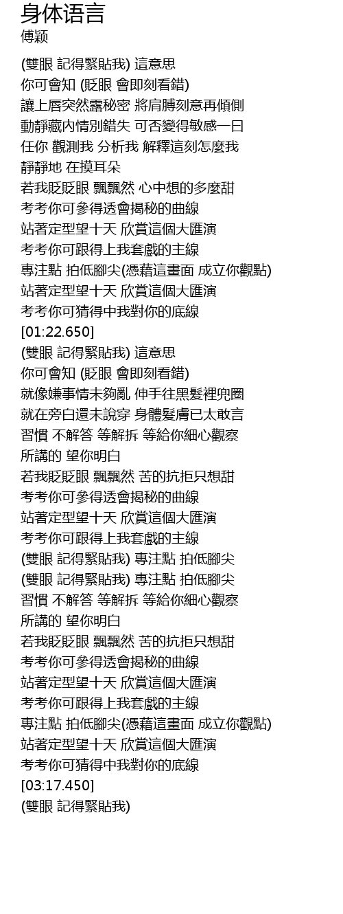 | [01:26.540] | (雙眼 記得緊貼我) 這意思 |