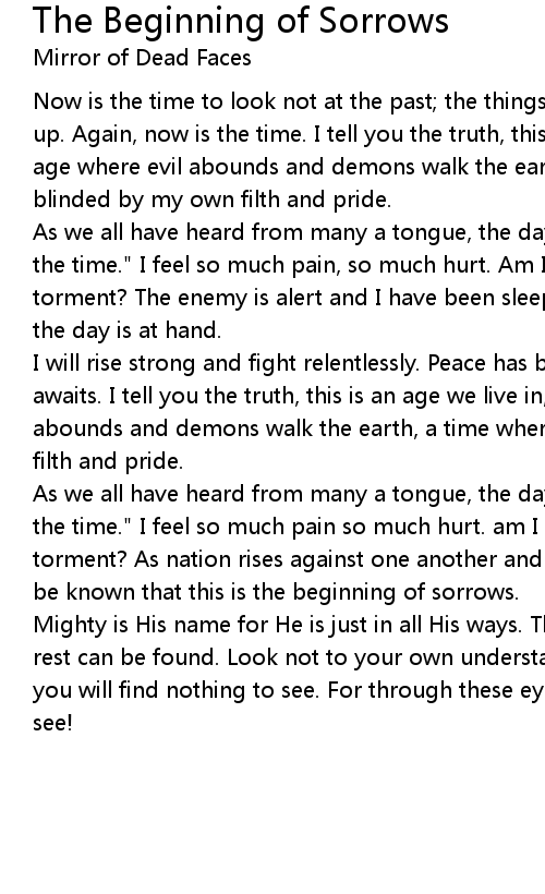 As we all have heard from many a tongue, the day is near for this is a "sign of the time." I feel so much pain so much hurt. am I alone in this struggle of torment? As nation rises against one another and kingdom against kingdom, let it be known that this is the beginning of sorrows. |