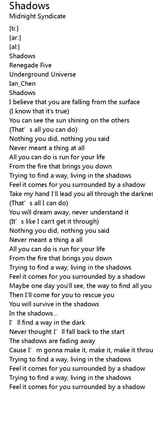 | [01:52.44] | Trying to find a way, living in the shadows |